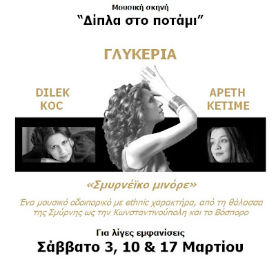 Η Γλυκερία και η παρέα της επί σκηνής μας ταξιδεύουν με μοναδικές ερμηνείες και Ethnic διάθεση, στα μουσικά μονοπάτια της Ανατολής. Από τη θάλασσα της Σμύρνης ως την Κωνσταντινούπολη και το Βόσπορο κι από την αγορά της Καππαδοκίας και τα καφέ-αμάν ως την Αγιά Σοφιά, μεταφέροντας μας την μουσική ατμόσφαιρα στις ελληνο-αρμενικές γειτονιές, πριν από τον τραγικό Σεπτέμβρη του 1922.